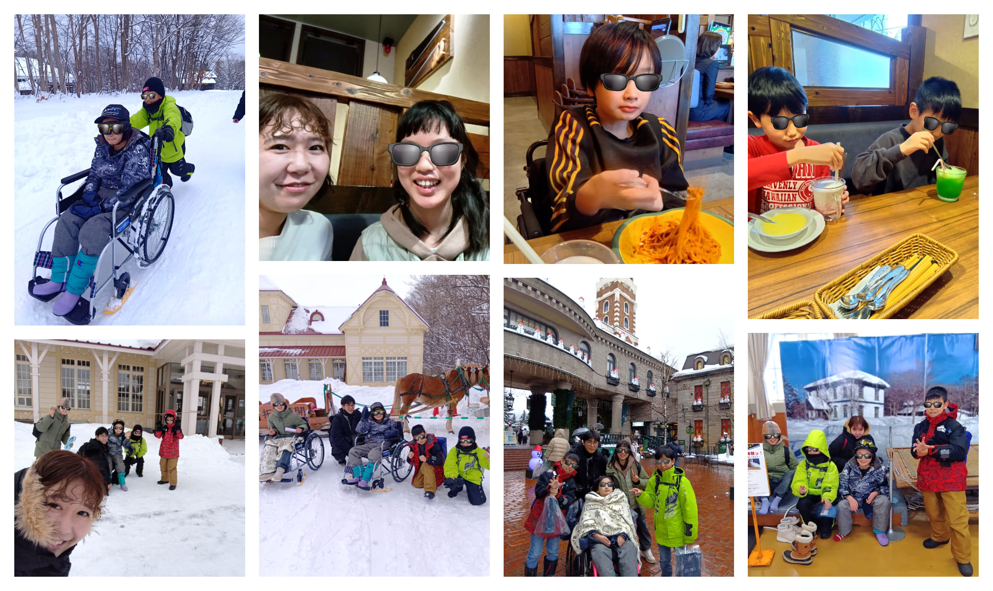 旅行が始まると、長い車内でも楽しく会話が弾み、開拓の村では操作の難しい雪上車いすに苦戦しながらも、古い街並みや建物を見て回りました。びっくりドンキーでお腹いっぱい食べた後は、白い恋人パークでお土産選びも楽しみました。