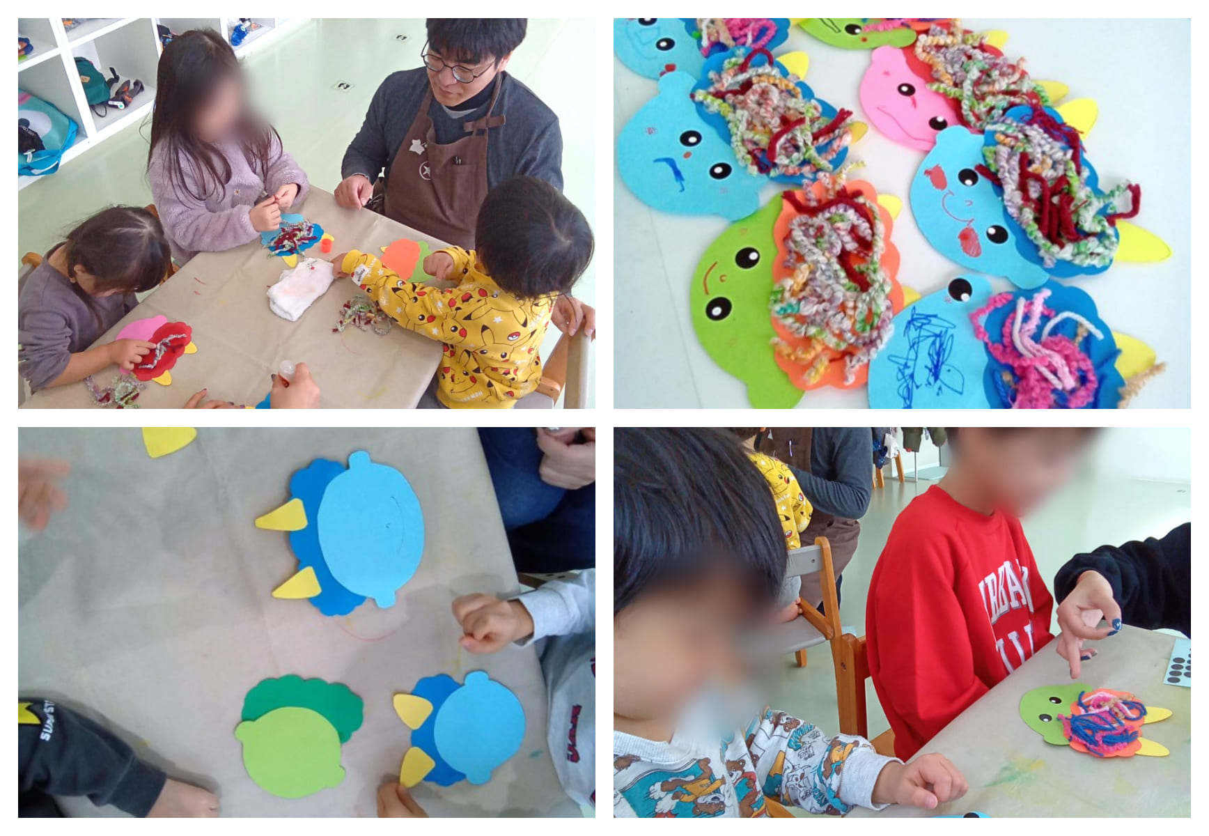 新年初のあいびーの製作は鬼の製作にしました。「2月にあるイベント、何かわかるかな?」と聞くと……「節分!」「鬼!」「豆まくやつ!」みんな大正解です!鬼のイベントがあることを知っている子が多いようでした。椅子に座ったところでピンク、青、黄色、黄緑の顔の色を子どもたち自身に選んでもらい、製作スタートです!切り取ってあるパーツを貼り、まずは鬼の形を作ります。その後頭にのりを貼り、ペタペタと毛糸をつけています。お顔シールを貼ったり、お顔を描いたりととってもかわいく作ってくれています。鬼の話をすると「保育園に鬼が来るの怖い」といまから鬼を怖がる様子が見られていました。今後も感触を感じながら子どもたちがイベントの楽しさを感じられる製作を考えていきたいと思います!