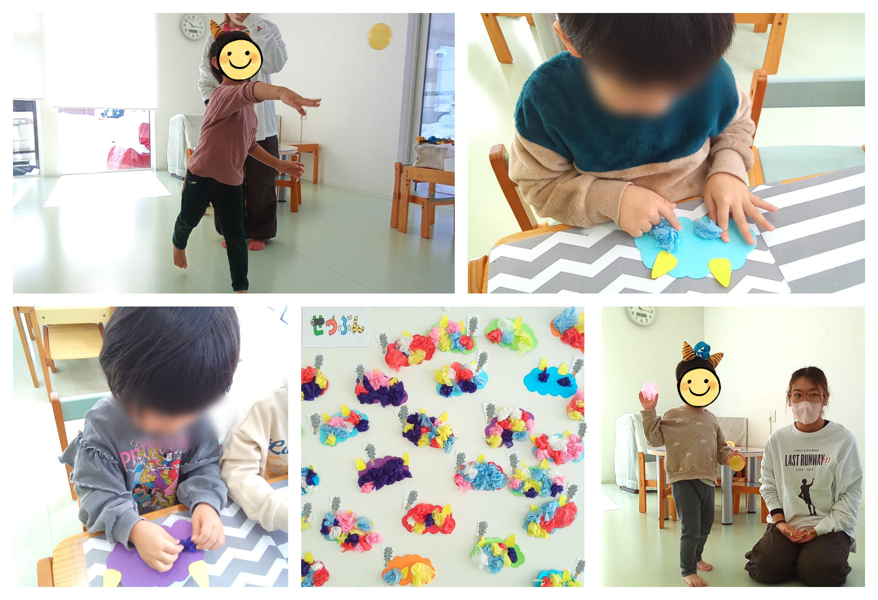 暦上は立春を迎えましたが、外はまだまだ雪景色…緑苑台あいびーでは、2月3日の節分に向けて、制作を行いました。「心の鬼をやっつけよう!」と子どもたちにお面を作ってもらいました。「どの色にしようかな?」と台紙と髪の毛の色を選び、くしゃくしゃとお花紙を手で丸めて完成させました。できたお面を発表してもらうと、それぞれポイントを自分の言葉で伝えてくれました。自分の言葉で伝える…それも大事な支援の一つです。