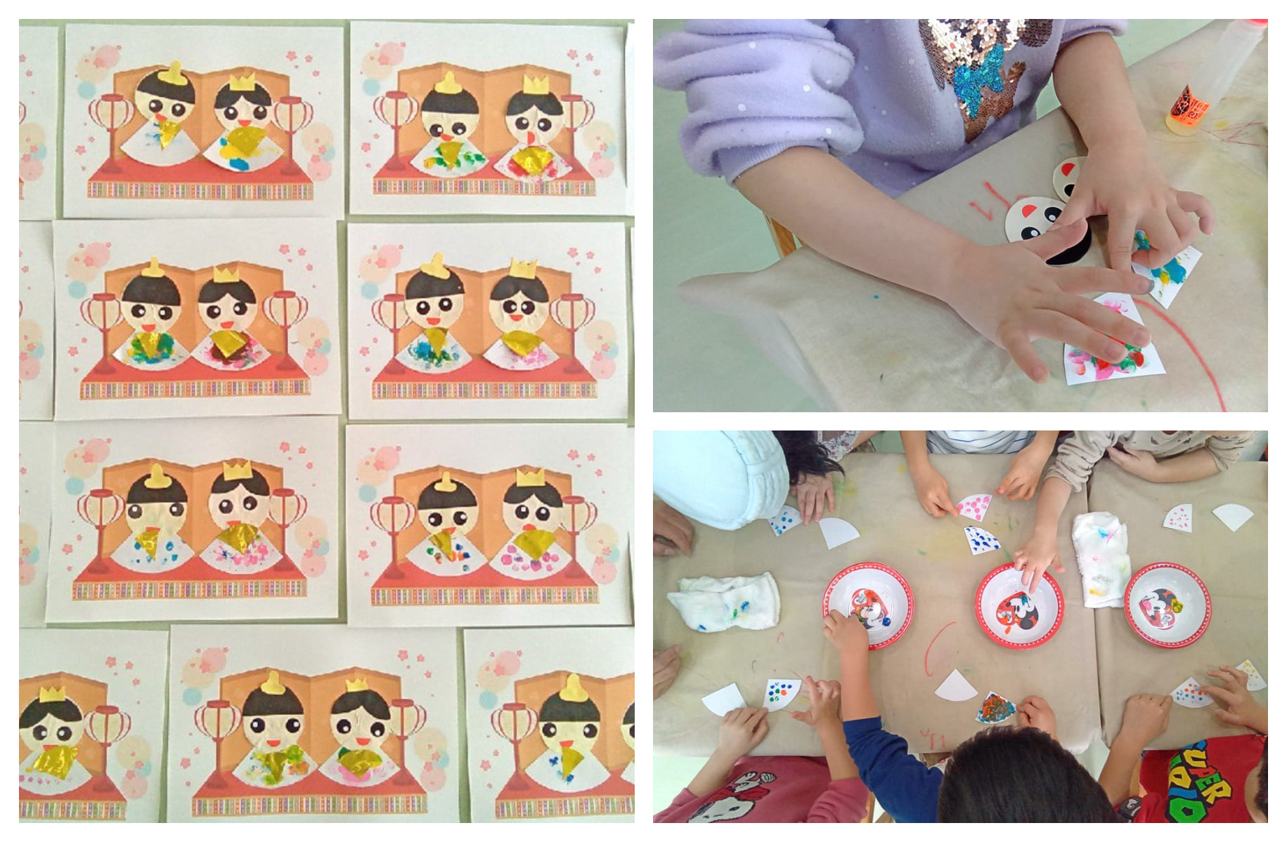 樽川あいびーの今月の製作の様子をお伝えしますね。3月は「ひな祭り」ということも有って、今月は「おひなさま」の製作をしました。いつも小集団の会議を開き「今月は何にする?」と話し合いをします。「バレンタイン」と「ひな祭り」が候補になって、「ひな祭り」に決定しました。製作担当は、毎日の忙しい業務の中かわいらしいお手本を作ってくれましたよ!さあ、製作当日です。まずはお内裏様とお雛様のお顔に目を付けます。「見てみて、目があっちこっちにいっちゃったー」と楽しそうな声が聞こえてきました。次は、いよいよ絵の具の登場です。お雛様のお洋服を絵の具できれいに色を付けていきます。まずは、指に絵の具をつけてぺたぺた。「次は、黄色がいい」「僕は、あおー」とまたまた楽しそうな声が。洋服を汚さないように職員は冷や汗たらりでした( ´∀` )。