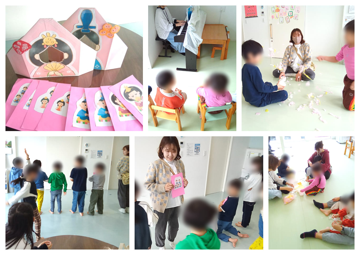 あいびーのひなまつりは、ひなまつりにちなんだ絵本を読んだり、歌を歌ったりしながら季節感を楽しみました。ピンクや白のお花紙をちぎってうちわで扇いだ花吹雪体験では、紙をちぎる大きさを調整したり、花吹雪を投げる人と仰ぐ人にわかれて協力したりと工夫しています。最後は顔はめパネルを使って写真撮影大会となりました。花吹雪を担当するお友達が演出係となり撮影を盛り上げてくれています。最後は力いっぱい仰いだため「暑い暑い」と汗をかいているお友達もいましたよ。