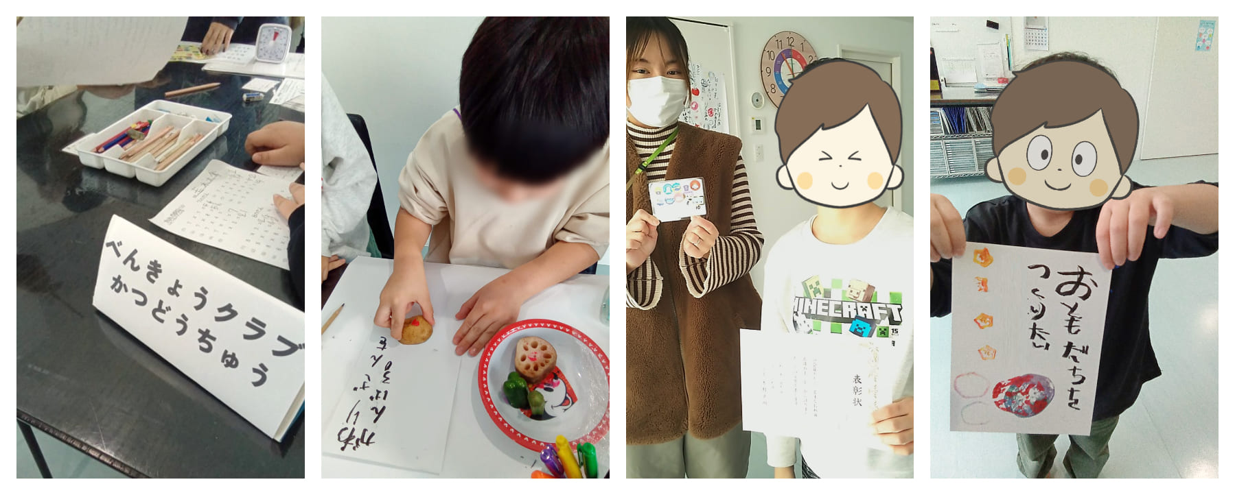 新年を迎え、今年の抱負・目標・決意など、自身がテーマを選び、筆ペンを使ってミニ書初めをしました。学習面や対人面、自己管理や家での役割、自身が今年したいことなどなど、みんな真剣にテーマを考えて決め、丁寧に書きあげました。その後はじゃがいも、オクラ、れんこん、ピーマンの断面を活かした野菜スタンプを思い思いに捺しました。色遣いや配置など、どの子もセンスの光る作品に仕上がっています。1月いっぱい活動室に掲示します。それぞれの決意や願いが達成できる1年になりますように。