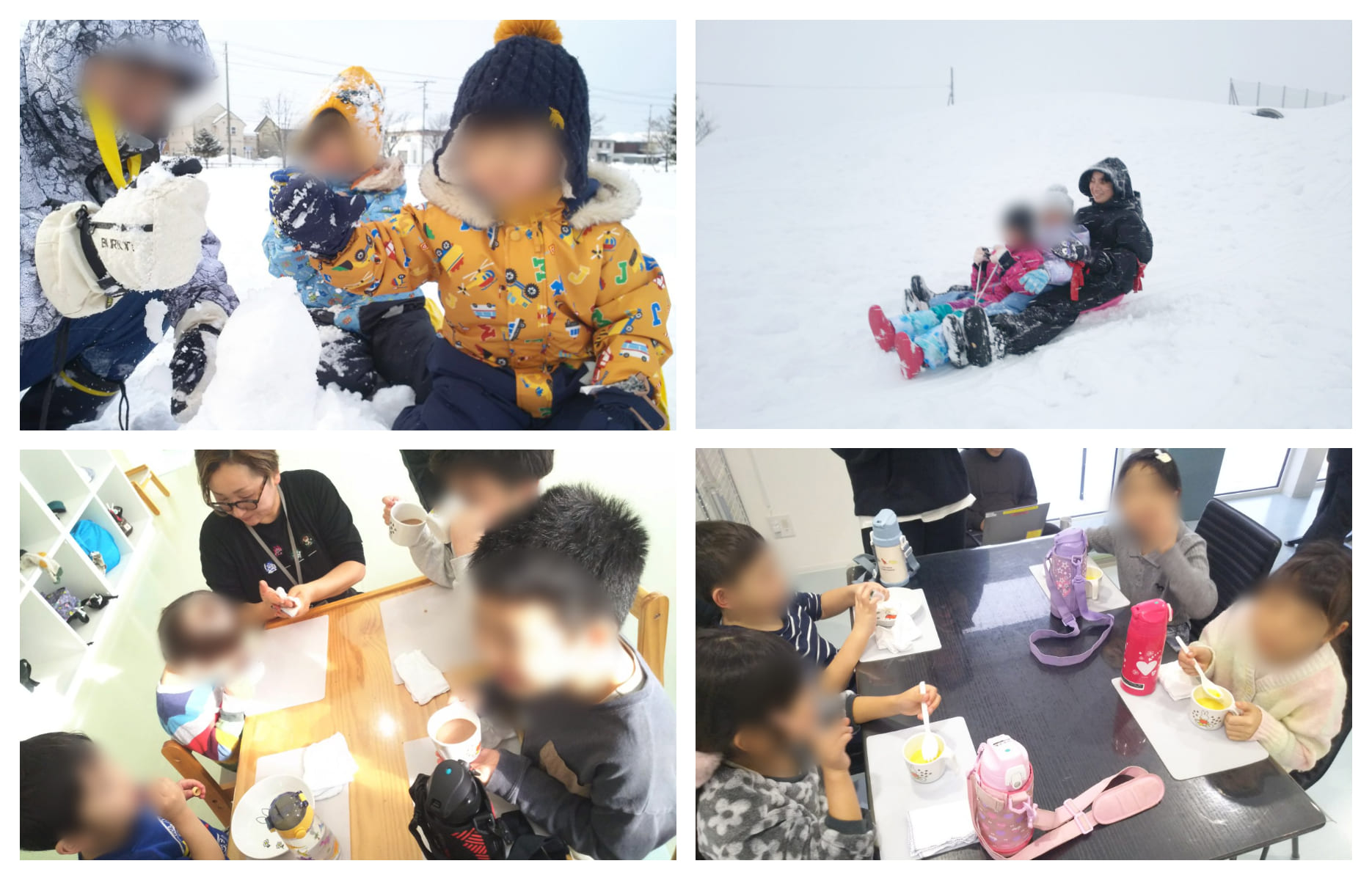 さあ、フェスティバル当日です。お天気も味方してくれて開催することが出来ましたよ。あいびーではわくわくが止まらずに職員から声掛けを受ける子もいましたが、雪だるま作り、そり滑りととっても楽しそうな様子が見られました。戻ってからの「大きくなる魔法がかかったミロ」をみんなでいただいて帰路につきました。午後からのぽらりすでも大成功です!まず、いつもとは違い到着後にトイレに行ってから向かう事を話しても「大丈夫」と行く気満々です。班ごとに鉢巻をして身支度をし、いざフェスティバルへ。雪だるま作りでは、児童と一緒に職員も楽しく参加して作成しました。大きな雪だるま、大家族の雪だるまとそれぞれ力作がそろいました。そり滑りでは、大人も子供もいい笑顔で雪だらけになりながらも笑顔が絶えませんでした。楽しい気もちを胸に、お部屋に戻ってからは「おやつとホットスープタイム」で体を温め帰路につきました。来年も待っていてねー(@^^)/~~~。