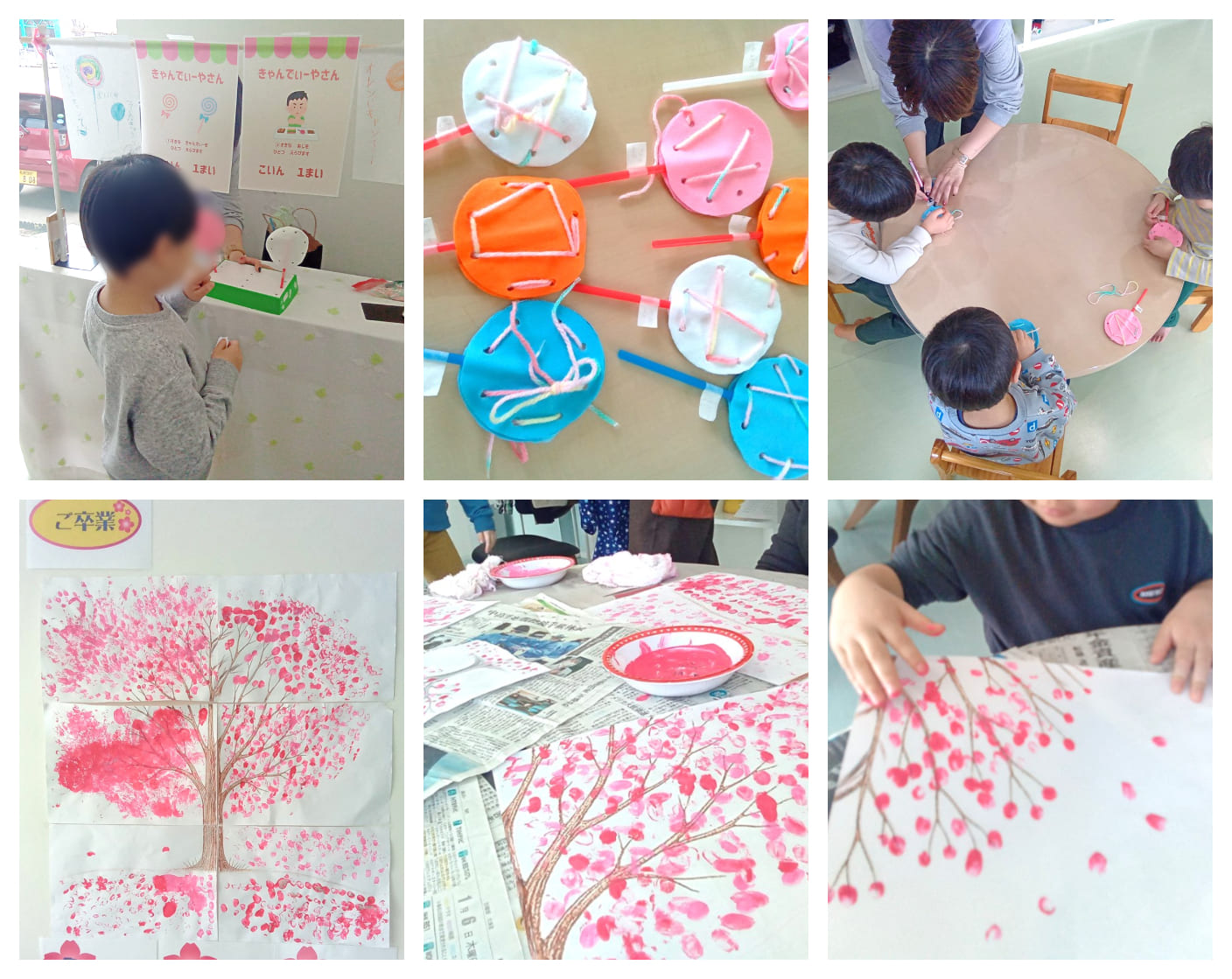 ぽらりすでは桜の木を指スタンプで彩りました。桜の木を6分割し、それぞれ担当を決めて桜の花びらをペタペタ。ペタペタ。赤と白の絵の具を混ぜると「混ぜたら混ぜたら〜ピンク!」と歌いながら、お友達とのやり取りも存分に楽しんでいました。立派な桜の木は、ぽらりすの皆の卒業・進級をお祝いするために、掲示しています。