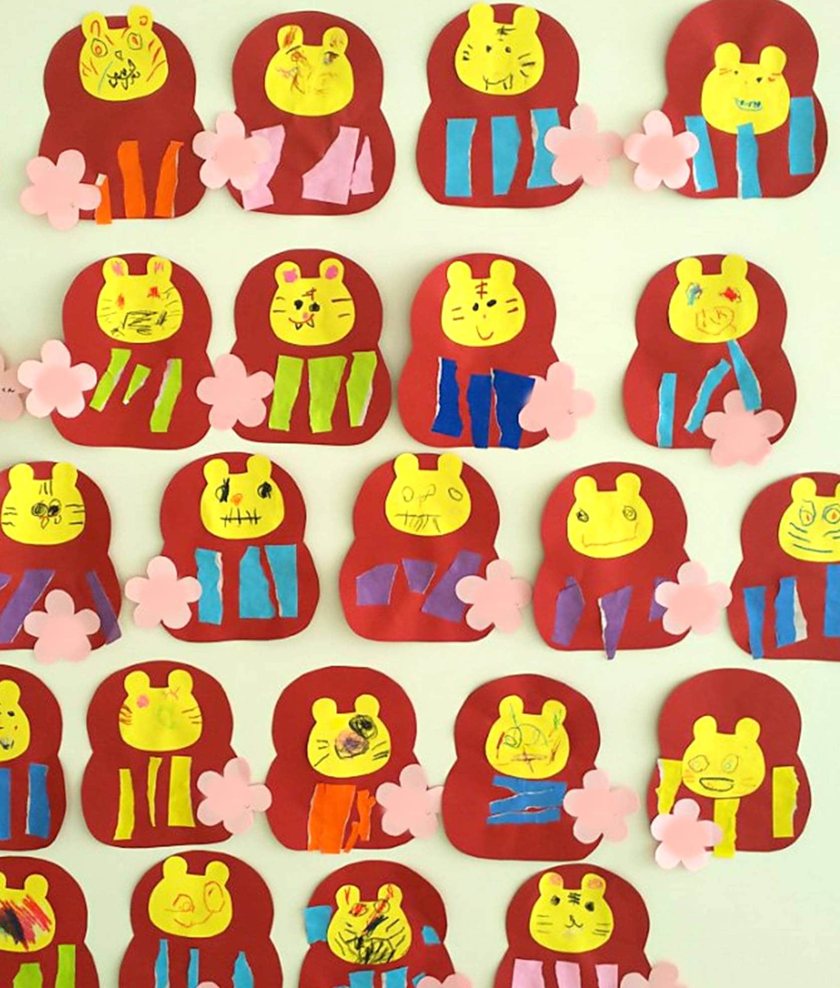 1月はお正月のダルマと、今年の干支の寅を合わせて「トラのダルマ」をクレヨン、でんぷん糊、折り紙を用いて製作しました。職員の見本を見て真似をして全く一緒にしようと頑張っている児童や、自分が思う顔を描き可愛かったり、怒っているような表情の寅を描いていました。今回は折り紙をちぎる作業も工程として入れましたが、折り紙をまっすぐちぎる動作は単純な動作のようで少し難しい様子もありましたが頑張って行っていました。