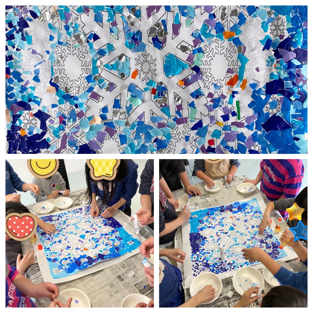 さて、ぽらりすの制作活動第三弾「ちぎり絵」も、大雪にちなんだ(まさかここまで積もるとは予想もしませんでしたが…)「氷の結晶」をテーマにしました。基本的にはこれまでと同じ流れで20分間の活動時間で扱う道具も一緒ですが、今回は図柄を白く残し、外側に色紙を貼っていくという工夫をしています。3回目となると、細かな指示がなくても時間が来ると自主的に準備をしてくれるこどもが多くいます。また、自主的にリーダーや副リーダー、副副リーダーとまとめ役を担ってくれたるこどもも増え、折り紙の色や大きさの調整や指示を出してくれています。回数を重ねるごとに全体がまとまってきており、「やりたくないな」という気持ちがあっても貼り進めるうちに集中したり、お友達との関わりも深まったりと作品の完成度以上にこども同士の関係性が光った活動となりました。