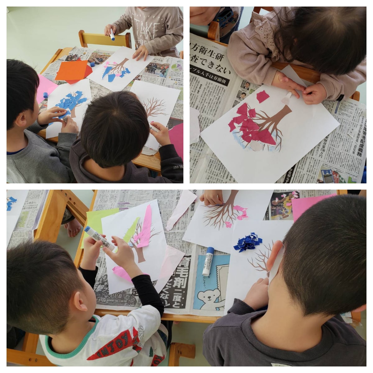 集中力・指先の機能促進を目的として行っており、みんな初めから最後まで立ち上がったり他の事に目移りすることなく、集中して取り組めています。ちぎり方も大きくちぎった方が綺麗と言う子や細かくちぎって貼っている子も居て、それぞれ工夫して行っていました。来月の作品もお楽しみに。