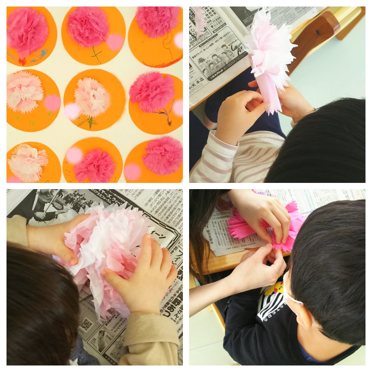 今年はお花紙をカーネーションに見立てて開く制作をしました。