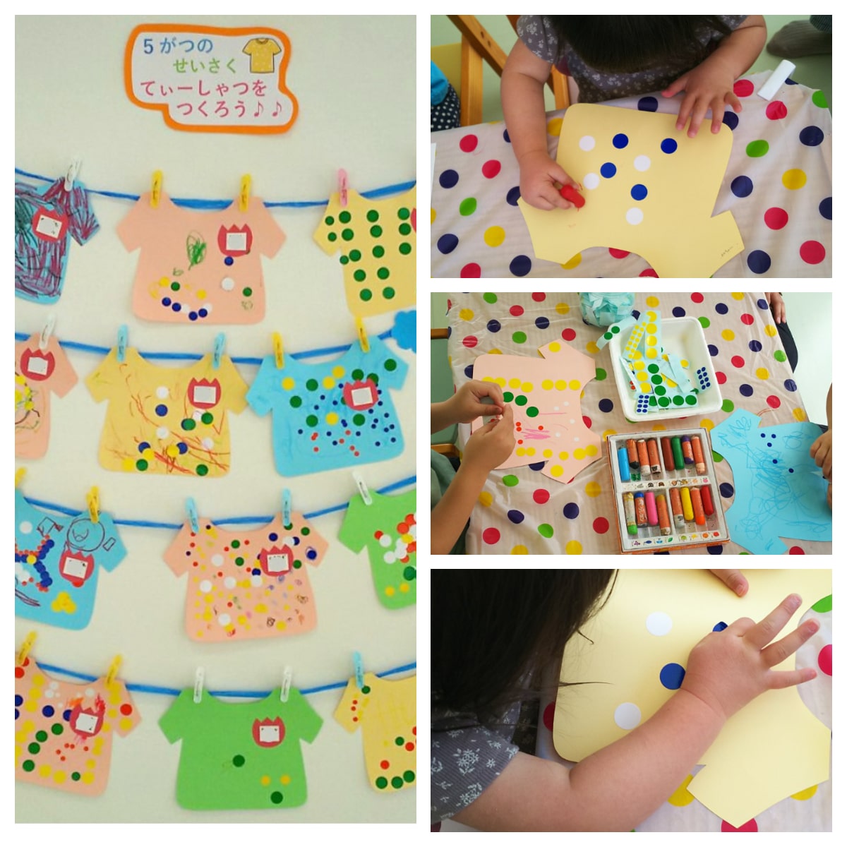 5月はシールとクレヨンを使用して「ティーシャツ作り」を行いました。身近にあるものをテーマに「テーマに沿って描く」事をねらいにして行ってみました。
