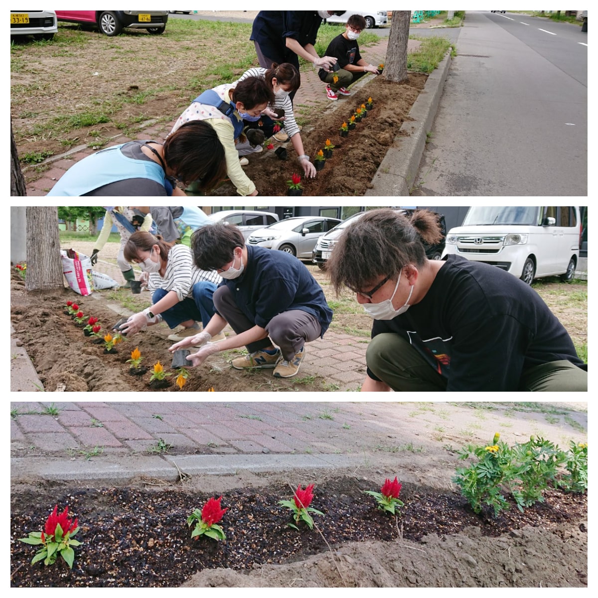 本日は樽川事業所前の歩道にある花壇の整備を行いました。雑草を抜き、土を入れ、数日間にわたり準備をすすめ、ようやくお花を植えることができました。地域の生活道路にもなっているので、少しでも楽しんでいただければ嬉しいです。近日中に街路樹の枝落としも予定されているので、雰囲気がさらに明るくなると思います。6月下旬には敷地内のアスファルト舗装が予定されています。少しずつ変わる風景をお楽しみください。