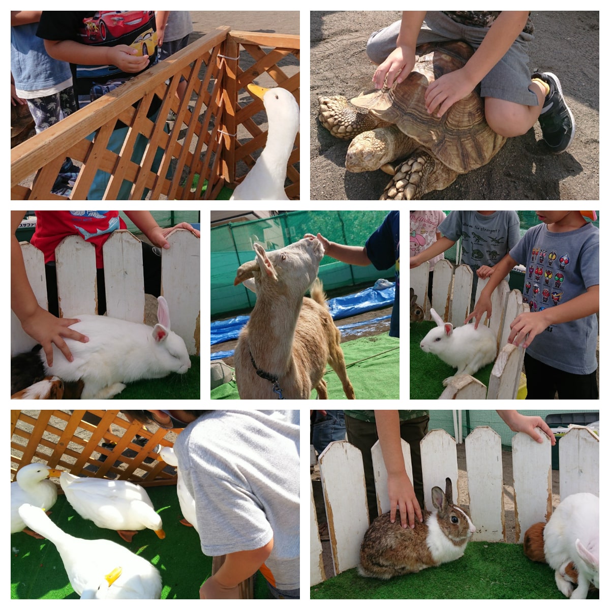 ウサギやモルモット等小動物やアヒルやヤギといった動物達との触れ合いを楽しみました。初めにお約束した通りに職員と手を繋いで離れないように行動する事が出来ていて、移動動物園が終わると、主催していただいた皆様に御礼を伝える事もできています。大変貴重な体験をさせていただきました。動物との触れ合いは優しい心を育てるとても良い経験になります。ご協力いただいた皆様に重ねて感謝申し上げます。