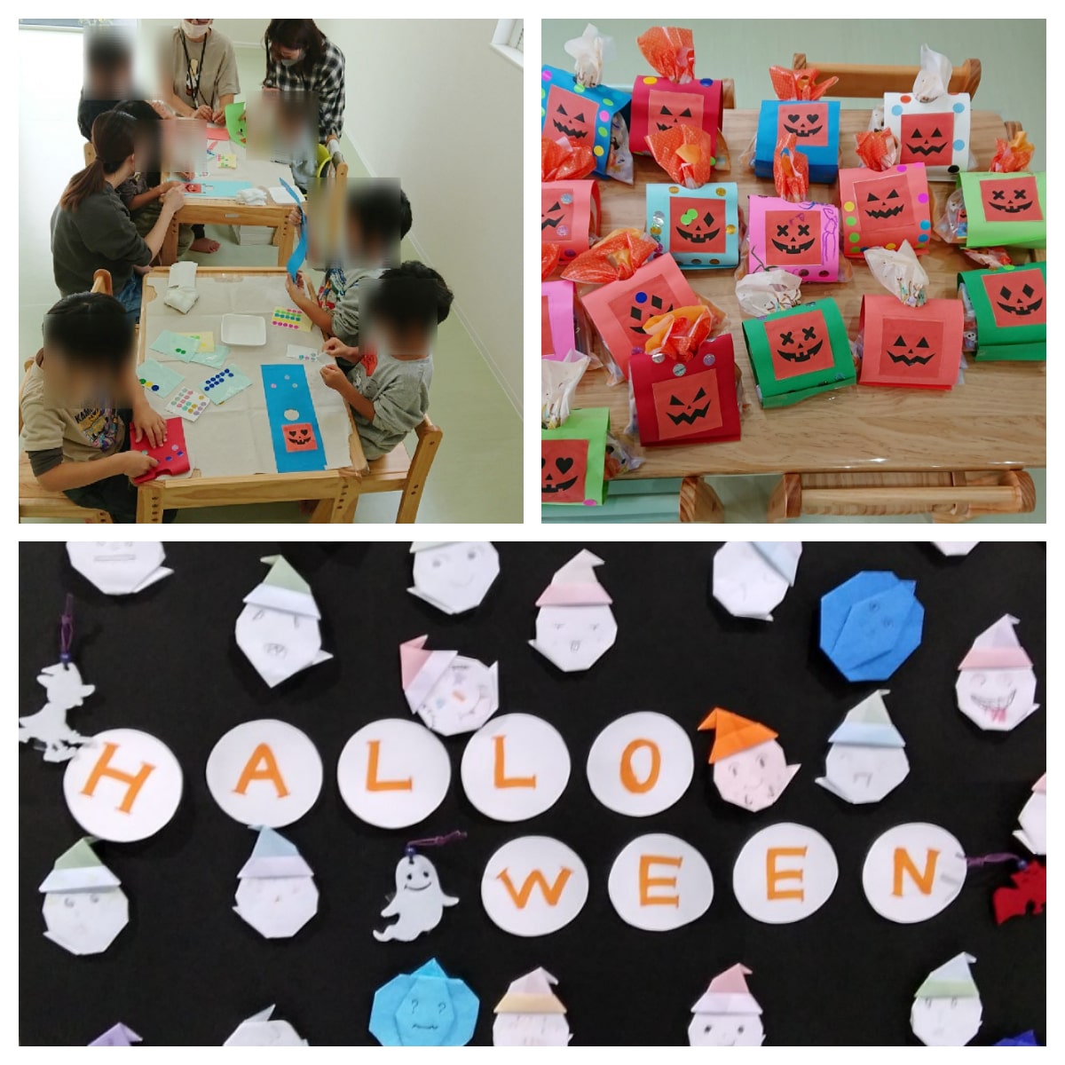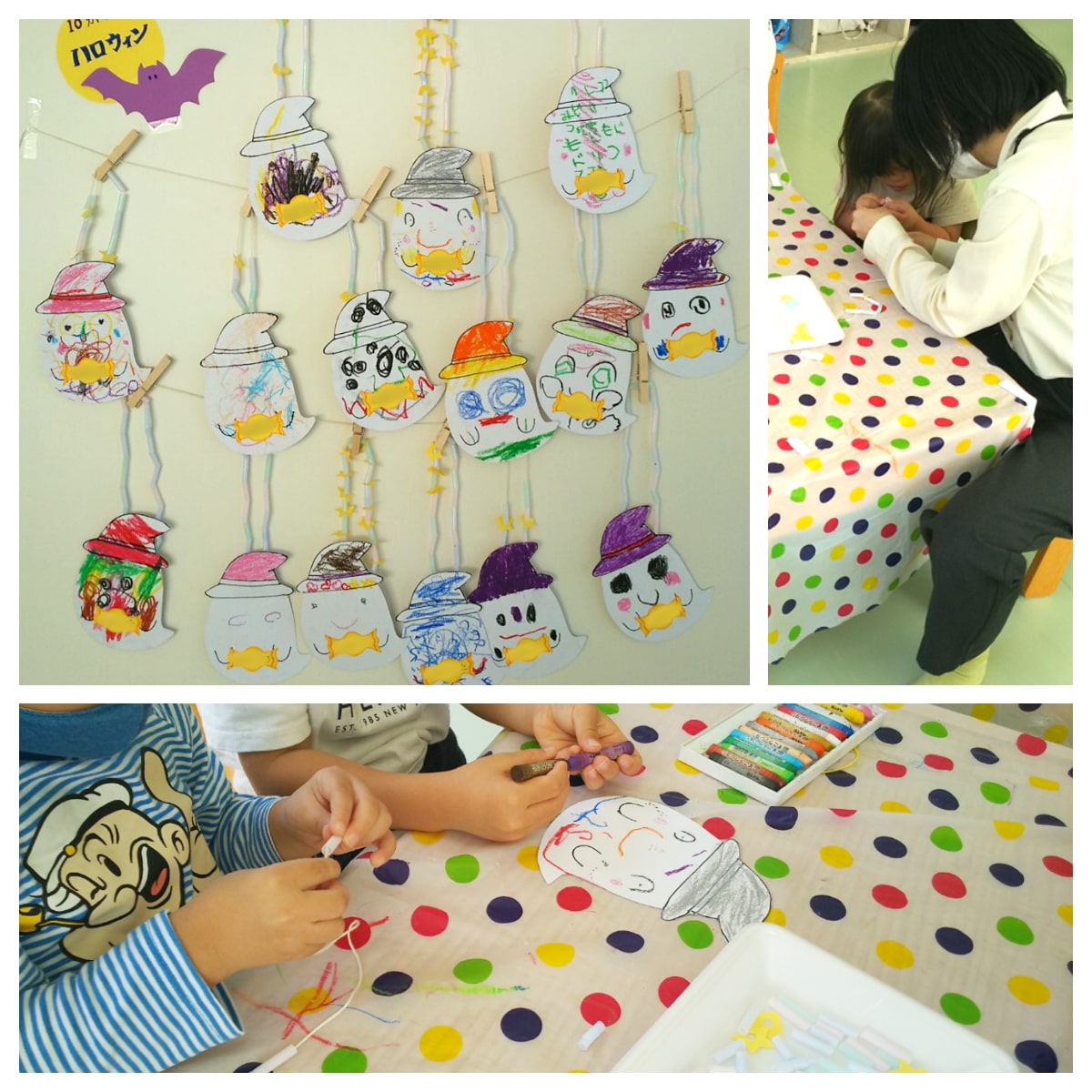 ぽらりすではこども達と職員一人一人が折り紙のオバケに顏を描き入れ、活動室内の『HAPPY HALLOWEEN』の文字の周りに皆で一つ一つ貼り付けて飾りました。個性的な表情や、意図的にさかさまに顔を描くなど楽しい作品になっています。〇〇くんのはどれ?△△先生のは?と飾りを眺めながら楽しい会話が聞かれました。