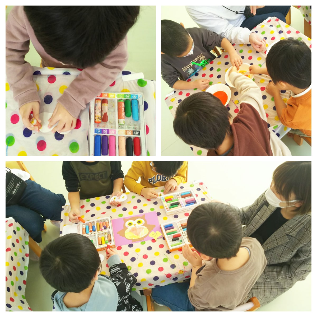 だんだんと寒くなり、もう少しで雪が降る季節になりました。11月の制作は「クレヨンと絵の具のにじみ絵でフクロウ」を作成しました。フクロウ製作にした理由として、秋は衣替え時期になり、動物たちも毛の生えかわりもあり大人になっていくという意味でフクロウにしました。使用した道具でクレヨンとは別に、絵の具でにじみ絵を行ったねらいは今回は秋をイメージした「赤色」、「橙色」、「黄色」に限定して行いました。感性や想像力を刺激することで、三色が混ざり合い色彩の感覚を楽しめたりします。製作際し前の絵本や、絵カードにてフクロウを見せた際「とりー!!」と大きな声で教えてくれている児童も居ますが、「フクロウでしょ!」とその鳥の名前を答える児童も居ました。まずは「クレヨン」でフクロウの目を描く際、見本を提示するとその見本を真似して同じように描く児童や、自分が思う怖い目や、ニコニコの目を描いていました。次の工程は「絵の具を使用しにじみ絵」を行っています。三角に折った半紙の三つ角に絵の具をつけるように説明をすると集中して行っていました。初めて半紙を使用し、お絵かきをしている紙とは違う素材ですぐに破れてしまう。と伝えると慎重に絵の具をつける児童や、半紙に三色全てつけてしまう児童が居たり、赤色と黄色、二色にしてしまう児童が居ました。クレヨンが苦手な児童でも、絵の具なら積極的に参加してくれている児童も居ました。12月も楽しい製作を予定しておりますのでお楽しみに!