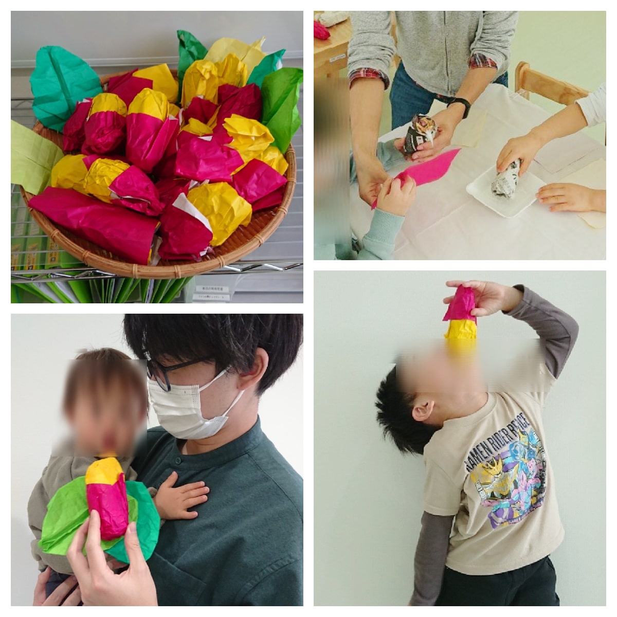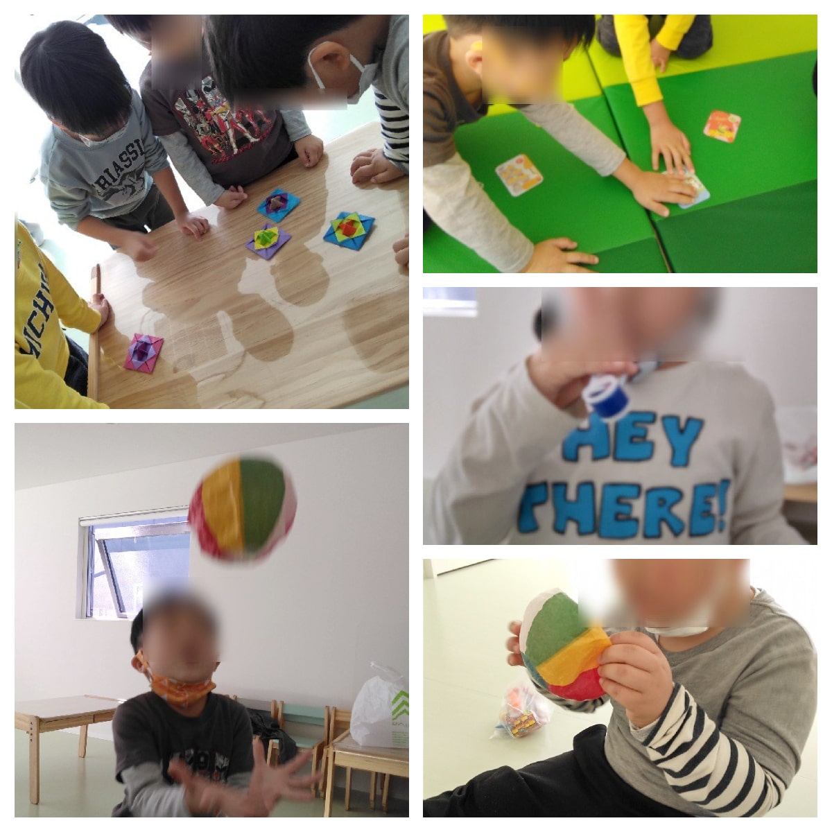 秋も深まった樽川事業所・あいびーではハロウィン制作とはがらりと違った雰囲気で『むかしのおもちゃで遊んでみよう』という活動を行いました。手作りの紙ごま回し、かるたあそび、紙ふうせんと吹き戻し(息を吹き込むとピーッ!っと紙の管が伸びる懐かしいおもちゃです)の3つのコーナーを3〜4名のグループで順にまわって遊びました。紙ふうせんや吹き戻しあそびでは、息を入れる経験が初めてで、膨らませたり管を伸ばすことが最初はうまくいきませんでしたが、上手に膨らませると嬉しそうに投げ上げていたり、何度も膨らませてみたり。勢い余って紙ふうせんを割ってしまう子もいました。そっと触れたり、力の加減をしないと割れてしまう経験も大切ですね。なつかしい遊びを通して、季節や文化に触れ、親しめるような活動をこれからも行っていきたいと思います。