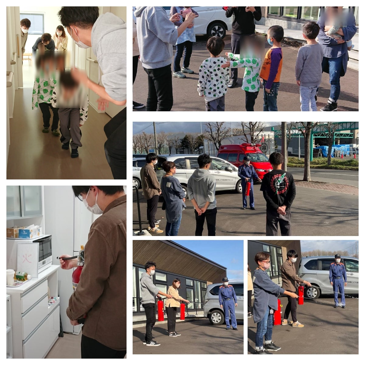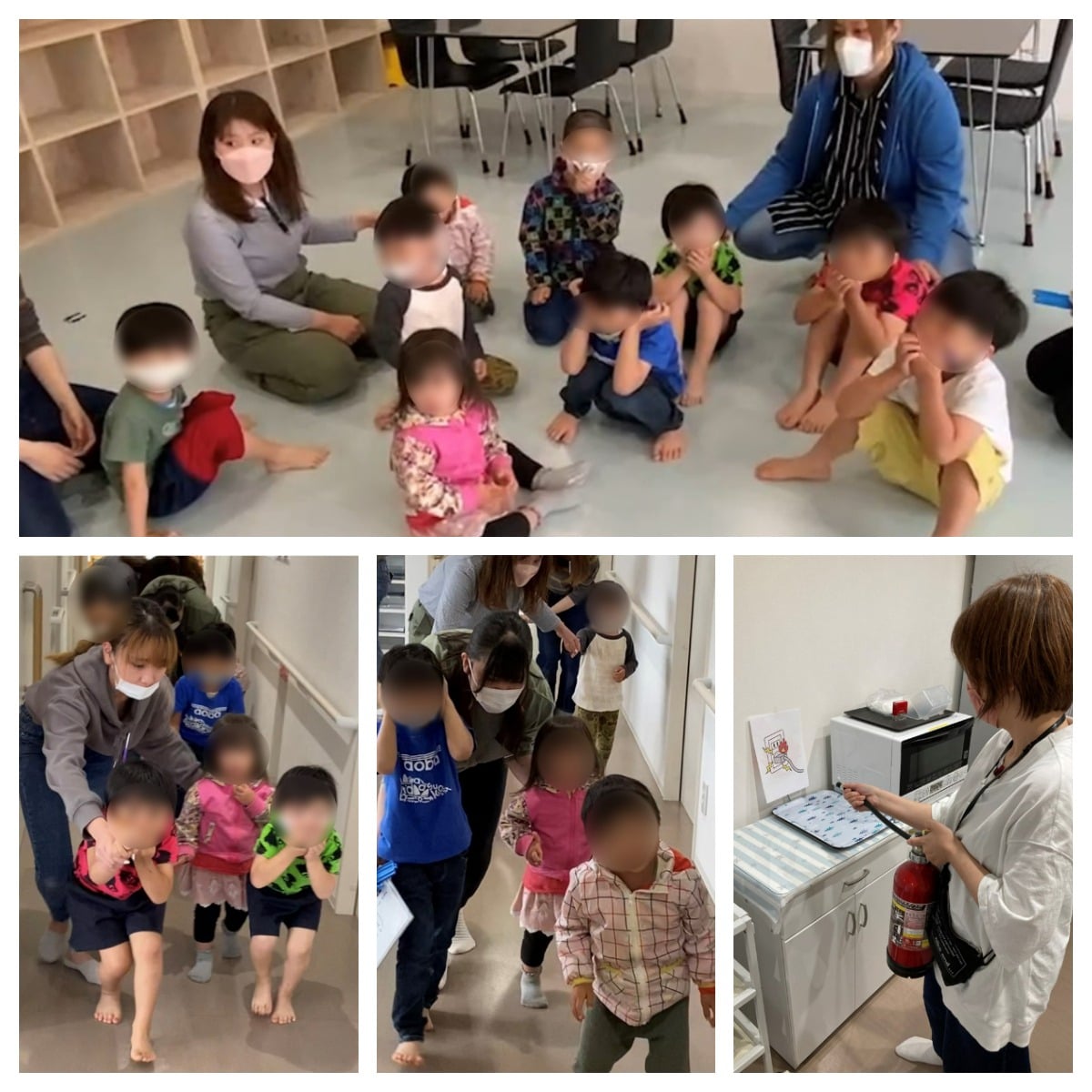 本日消防訓練を行っております。AM:11:00頃キッチンから火災発生予定とし、こどもたちには事前に消防訓練がある事を伝えて行っています。