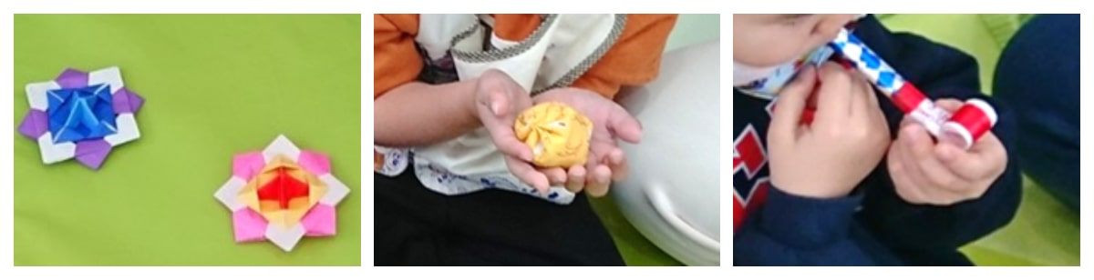 12/2(金)は「昔の遊びをしよう!」と言う活動を行いました。事前に昔の遊びの種類をいくつか伝えますが、「けん玉」、「お手玉」は見たことがあるとのことですが、「メンコ」、「吹き戻し」(息を吹き込むと巻いてある紙管が伸びる玩具)はあまり見たことがなく珍しそうな表情で、説明を聞いていました。今回は「お手玉」、「吹き戻し」を行いましたが、お手玉を上に高く上げ下に落とす遊びや、少し投げて遊ぶ様子が見られています。職員に遊び方(お手玉を上にあげ、手の甲に乗せて遊ぶ)を教えてもらうと、真似をしようと練習をしていました。次は吹き戻しを行いますが、コツをつかむまでに時間がかかってしまう様子がありました。一人の児童が出来ると、他の児童も頑張って行おうとする場面が見られています。もう少しで出来そうな児童に職員が応援すると恥ずかしそうな表情をしていますが、最後にできるとニコニコ笑顔で帰っていきました。今月はまだまだ始まったばかりですが、楽しい制作や活動を考えていますので、ご都合の合う方は是非ご参加ください。
