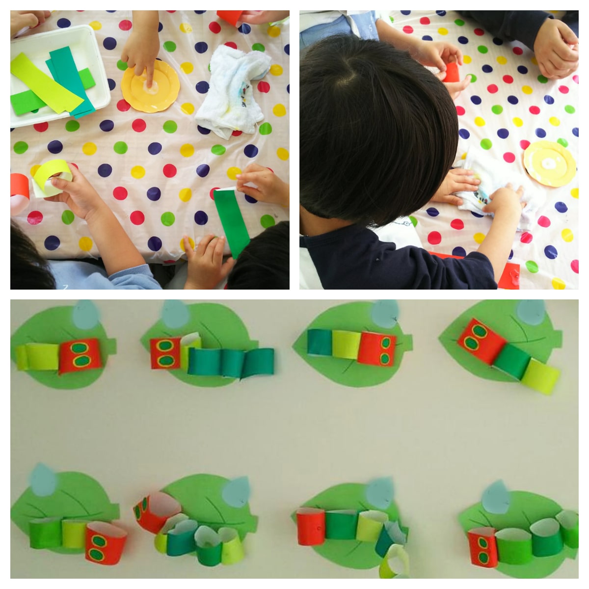 6月は、手糊と折り紙を使用して「はらぺこあおむし製作」を行いました。