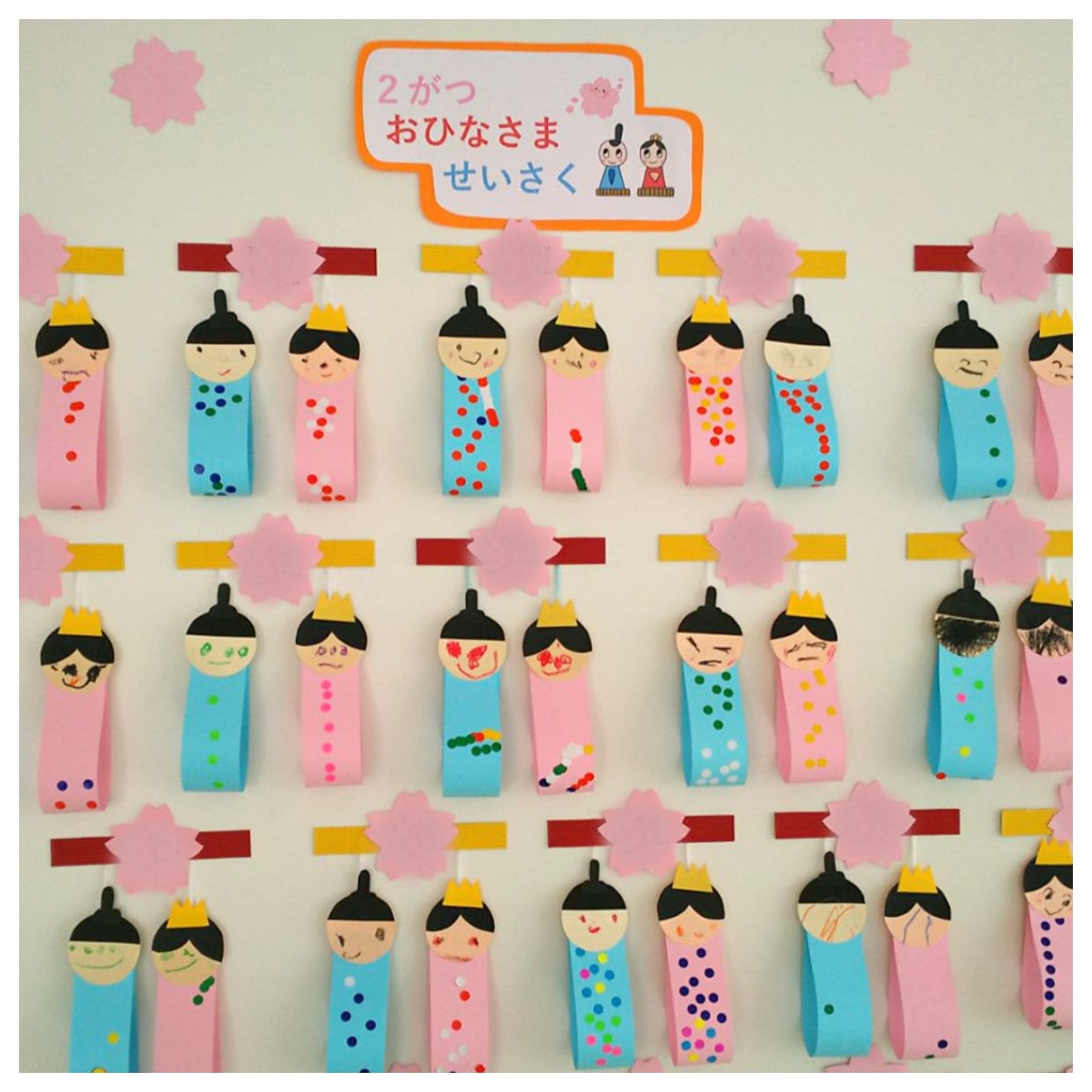 来月のひな祭りに向けてお雛様製作を行いました。着物となる画用紙にシールで模様を付けてから、お顔を描きました。見本の完成品を見せ、説明をしてから始めました。今回の製作では「思考力や想像力を膨らませる」事をねらいにして行っています。シール貼りはシールを貼る場所の指定はせずに自由に行いました。指定がないことで同じ場所に重ねて貼ったり、一色のシールを使用したり等、模様を自分で考えながら取り組む姿見られました。クレヨンでのお顔描きも以前の活動では「目、鼻、口」を描けなかったお子様が描けるようになっていたり、色を変えて工夫しながら描けていたりと成長が見られる活動になりました。個性的で素敵なお雛様が完成しています。来月も季節にちなんだ楽しい製作を予定していま
