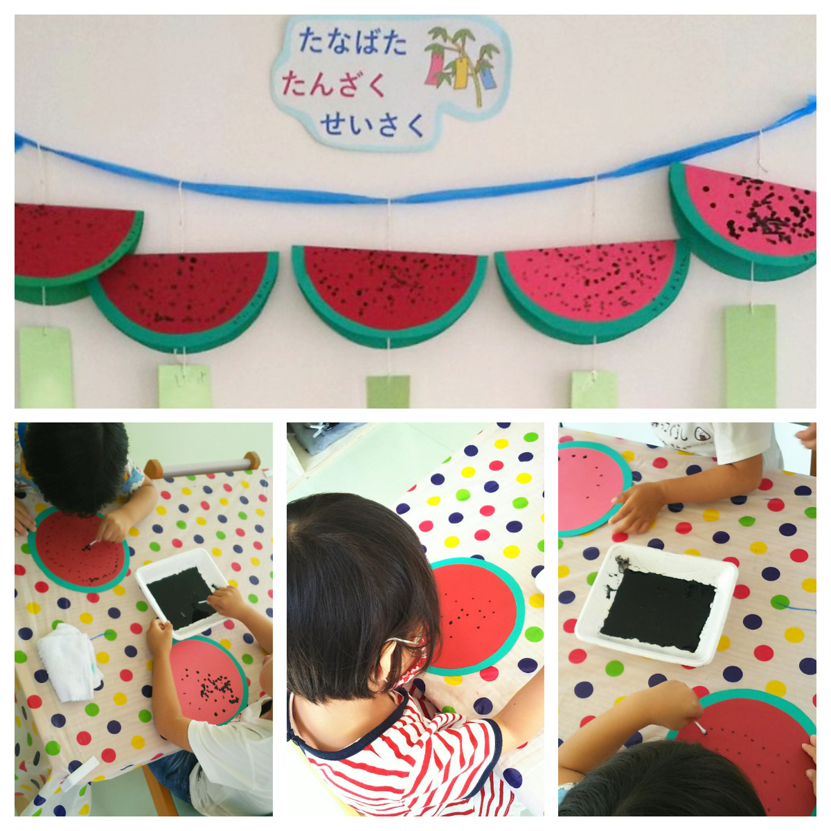 北海道では8月7日が七夕となっており、あいびーでも8月に七夕製作を行いました。綿棒を使用し、黒い絵の具でスイカの種を付けて短冊を作りました。先月の製作でも筆を使用し絵の具で弾き絵を行っており、道具と技法を変えた絵の具活動で絵の具の楽しさを知ることをねらいにして行いました。まず職員が手順を説明してから始めましたがこども達のよく知っている「スイカ」だった為かスムーズに取り組む事が出来ていました。一つ一つ丁寧に種付けする子や細かく沢山種を付ける子など様々でしたが、「種」ということを理解しておりとても上手に表現出来ていました。次に短冊にお願い事を書いてもらいました。自分で書くことが難しいお友達には職員が代筆して書いています。「足がはやくなりますように」「プリキュアになりたい」「リンゴが食べたい」等、自分で考えたお願い事を記しています。七夕は終わってしまいましたがもう少し短冊を飾って北海道の短い夏を楽しみたいと思います!