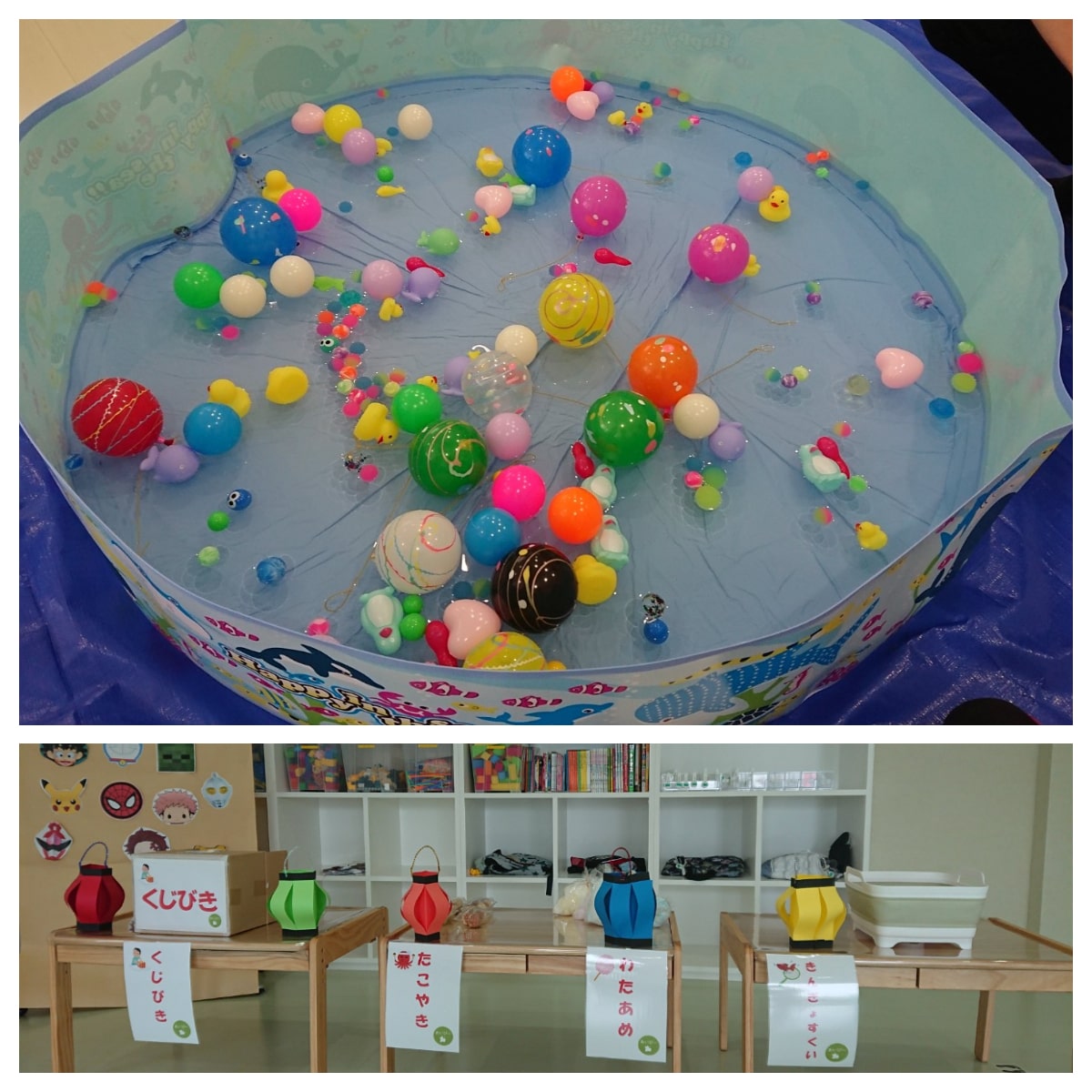 8月の活動として樽川事業所では夏祭りを行いました。今のご時世ではお祭りが中止になってしまうなど、夏祭りを体験する機会が少ないと思います。そこで、子供たちに夏祭りの気分を味わってもらいたく開催しました。あいびーでは、くじ引きや金魚すくいをしました。「くじ引き」などが書かれた引換券を職員に渡して、それと交換に体験ができるという流れで行いました。子供たちはくじ引きで手に入れたお面をつけ、夏祭りを楽しんでくれていました。ぽらりすでは、ヨーヨー釣りやスーパーボール掬いをしました。水で濡れると破れやすくなる紙でできたスーパーボール掬いを使用して行いましたが、子供によっては一度に大量に取ろうとして破れてしまう場面もあり、「あーーっ!」という声が響いていました。上手くいかなかった時はくじを引いてもらい、スプーンなどのお助けアイテムで再チャレンジ!最終的には皆ニコニコでした。成功体験は大事なことですが、失敗からも何かを学んでもらえると嬉しいですね。今年の樽川事業所の夏祭りは笑顔がたくさんでした。今後も、子供たちが季節に応じた体験ができるように企画したいと思います。